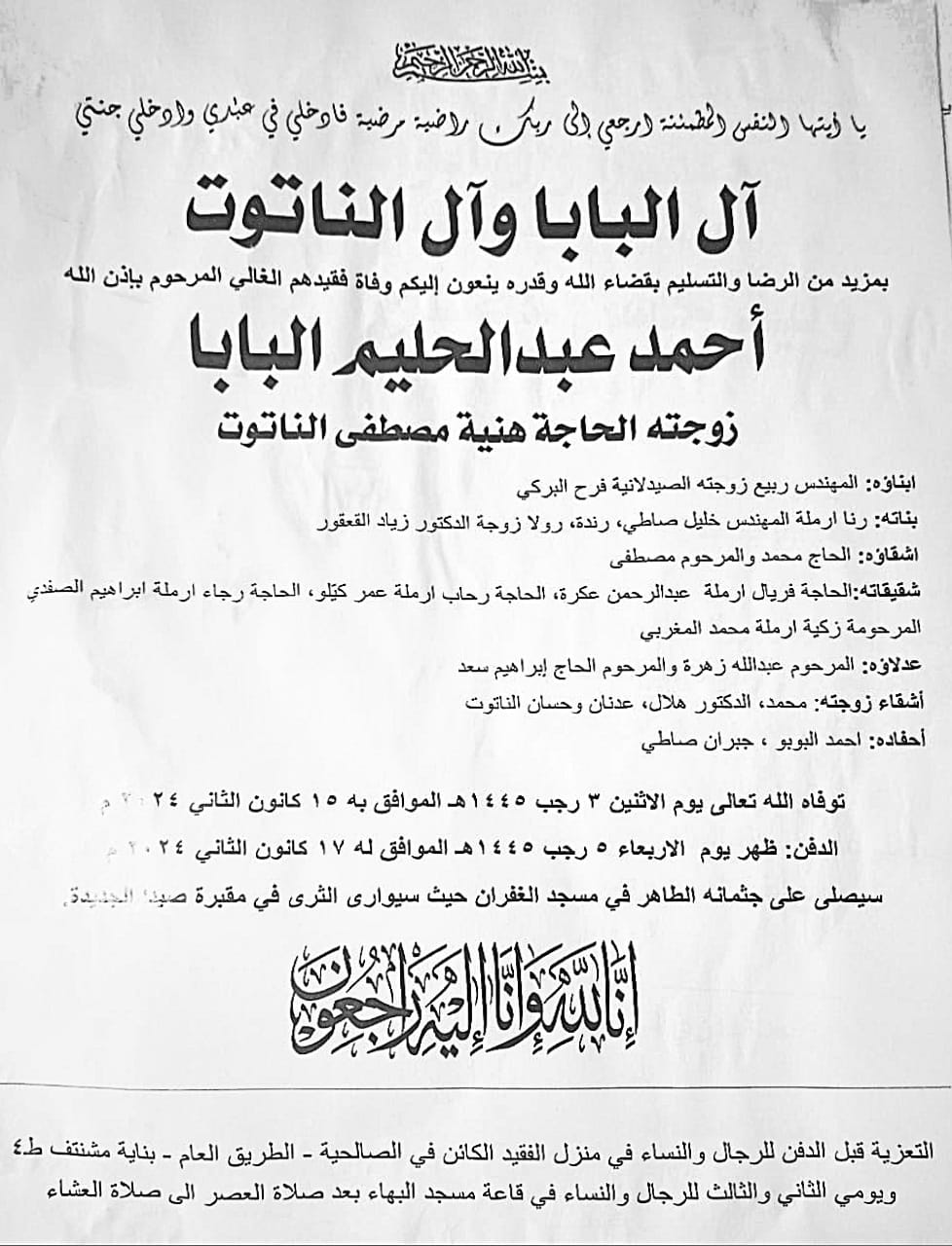 وفاة أحمد عبدالحليم البابا، الدفن ظهر يوم الأربعاء في 17 كانون الثاني 2024 الثلاثاء 16/كانون الثاني/2024 - 09:53 ص 1/16/2024 9:53:44 AM شارك