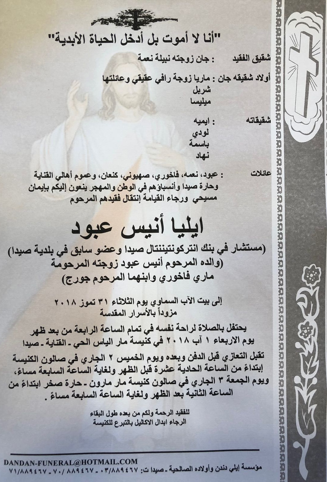 وفاة ايليا أنيس عبود، يحتفل بالصلاة لراحة نفسه بعد ظهر يوم الإربعاء 1 آب 2018 الثلاثاء 31/تموز/2018 - 04:33 م 7/31/2018 4:33:27 PM شارك