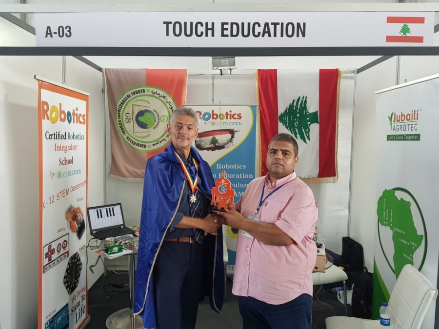 مبارك لشركة Touch Education الممثلة بالاستاذ موسى سويدان الذي فاز بالميدالية الذهبية و برائة اختراع عن منهج تعليم الروبوت كمادة تعليمية.