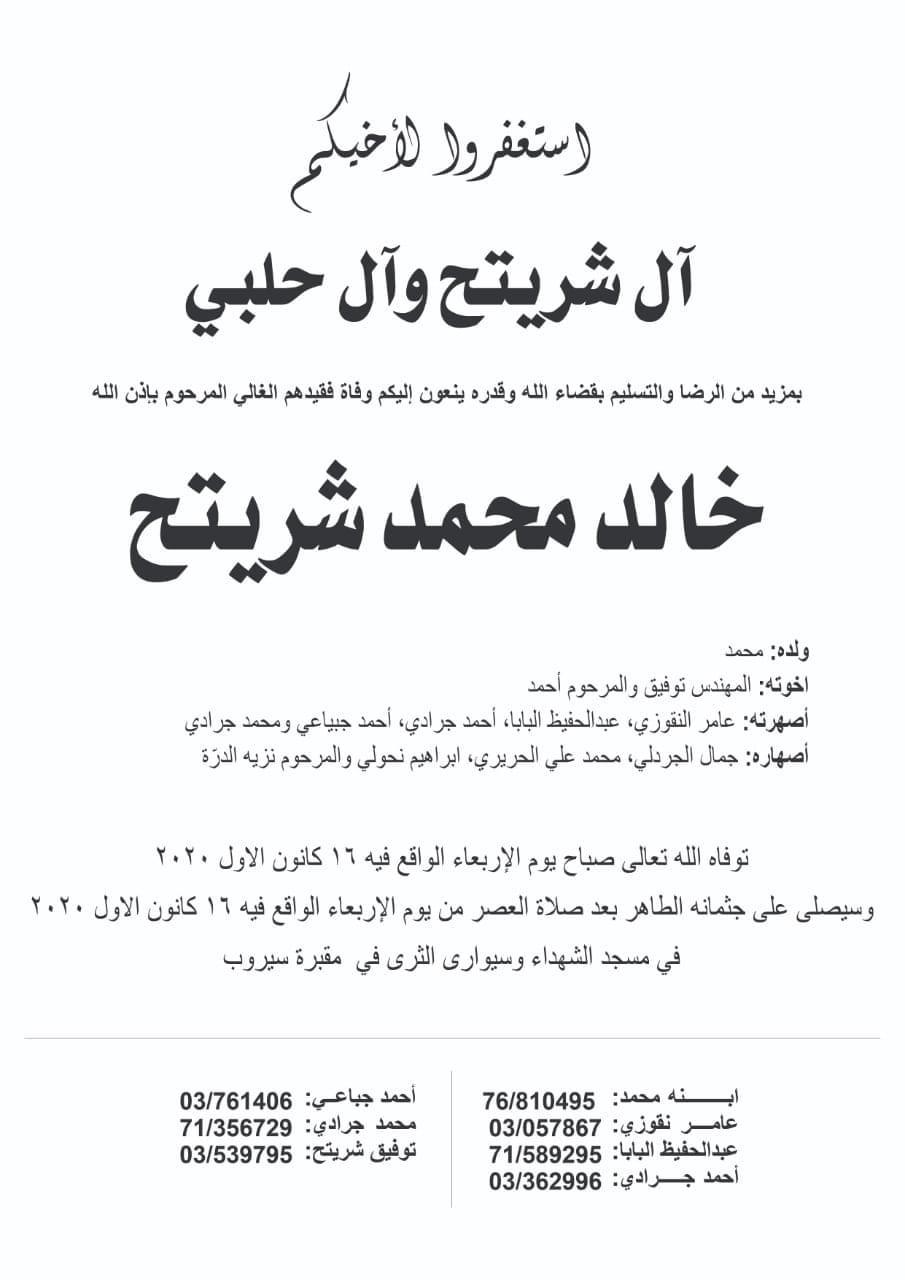 وفاة خالد محمد شريتح، الدفن بعد صلاة عصر يوم الاربعاء 16 كانون الاول 2020 الأربعاء 16/كانون الأول/2020 - 06:53 ص 12/16/2020 6:53:39 AM شارك
