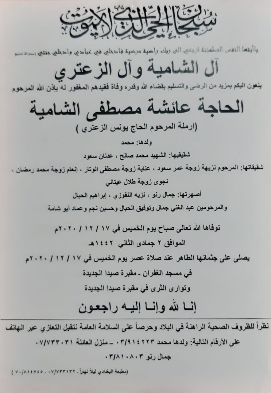 بمزيد من التسليم بقضاء الله وقدره انتقلت الى رحمة الله تعالى المرحومة الحاجة عائشة مصطفى الشامية